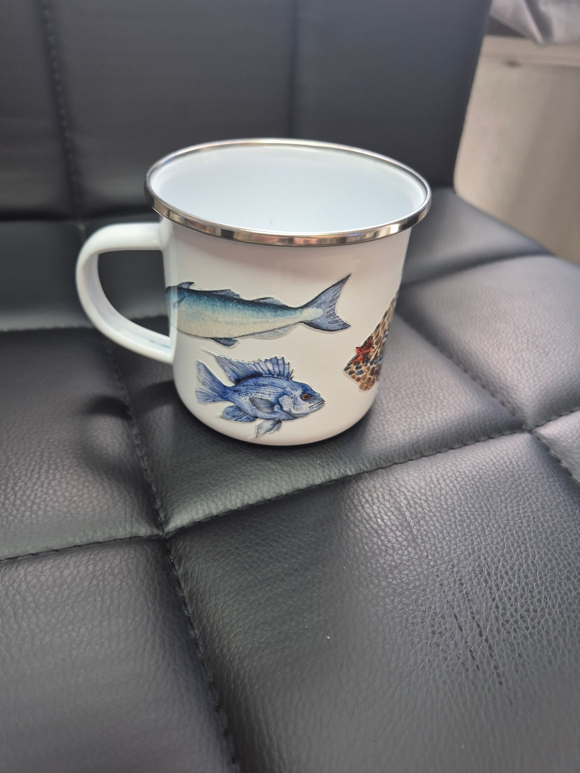 Weißer Emaille Becher mit Boot und versch. Fischen. Für Angler oder Fischliebhaber.